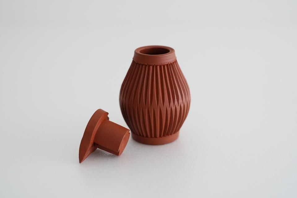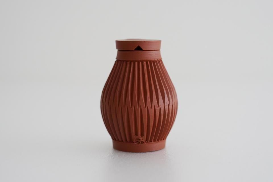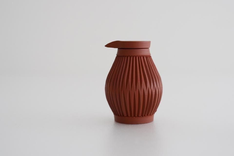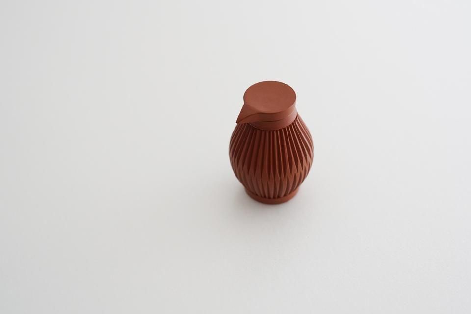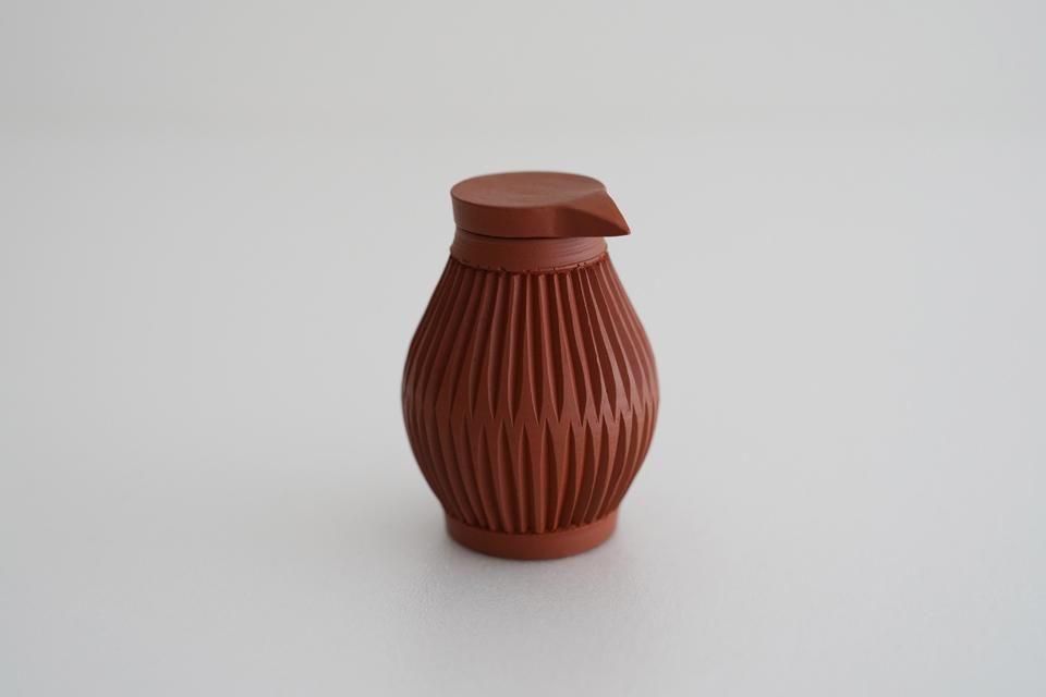 朱泥を用いて制作していただいた特別な「醤油さし」。深みのある鮮やかな朱色で繊細な風合いに仕上がりました。すっきりとしたフォルムが美しい大江さんの醤油さしは、蓋がぴったりとしまり、お醤油のキレがよく垂れる心配もありません。使いやすく、食卓に美しく馴染む醤油さしです。