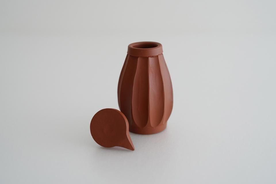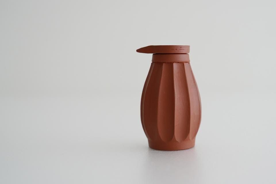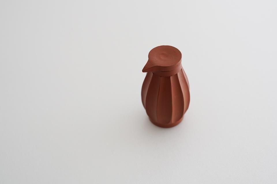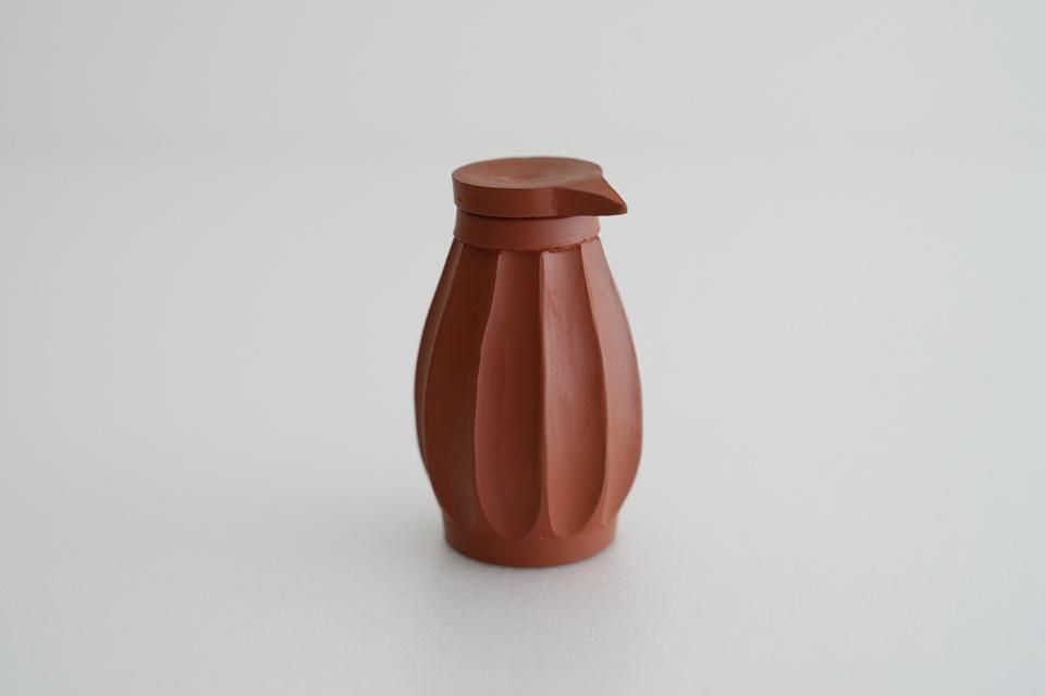 朱泥を用いて制作していただいた特別な「醤油さし」。深みのある鮮やかな朱色で繊細な風合いに仕上がりました。すっきりとしたフォルムが美しい大江さんの醤油さしは、蓋がぴったりとしまり、お醤油のキレがよく垂れる心配もありません。使いやすく、食卓に美しく馴染む醤油さしです。