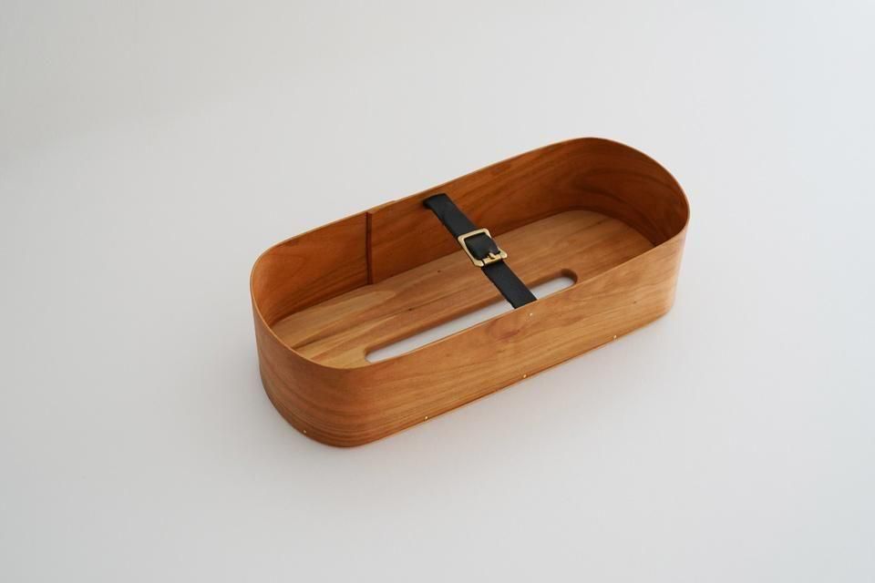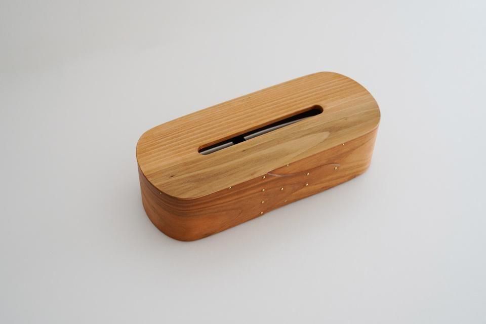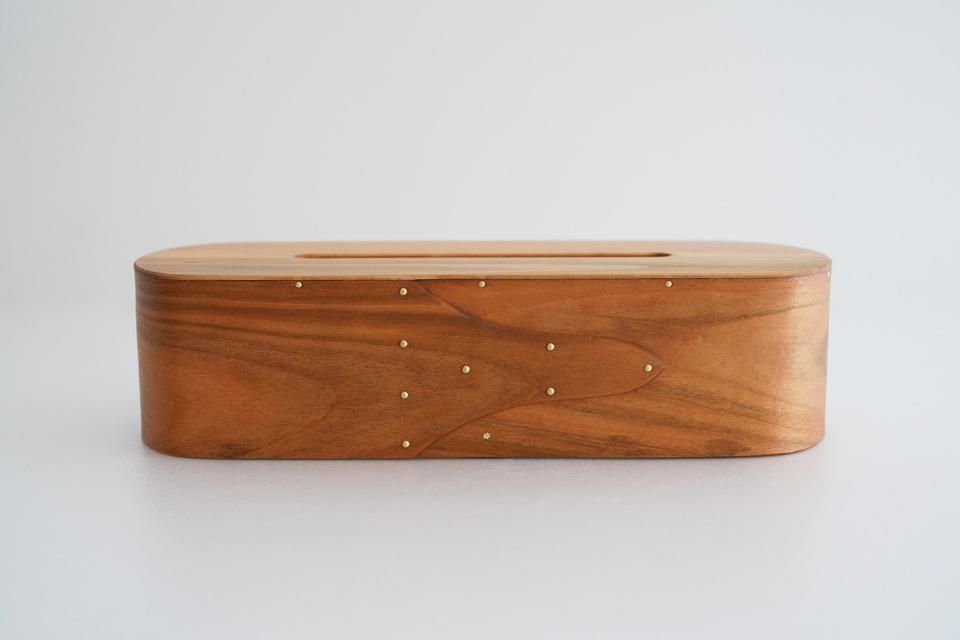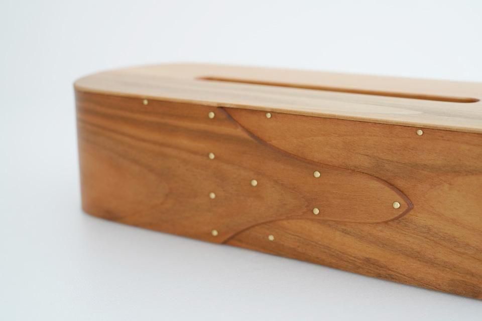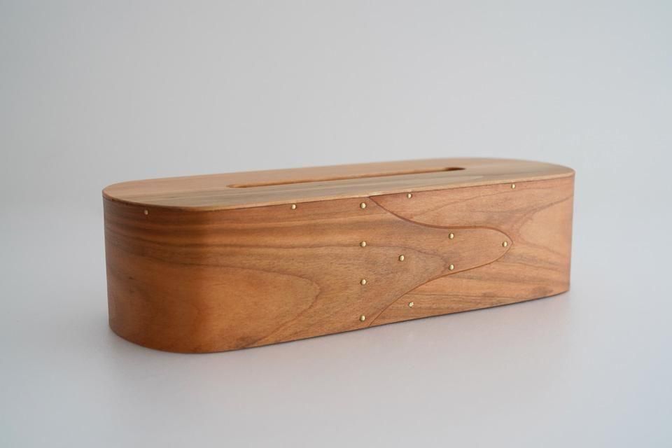 まる工芸・大澤昌史さんのティッシュケース。92℃で蒸して曲げて作られたティッシュケースは、丁寧な手仕事により完成度の高いものに仕上げられています。真鍮のリベットを使用しているなど、木と共に経年変化を楽しむことが出来ます。スワローテールもいいですが、こちらのソード型も素敵ですね。